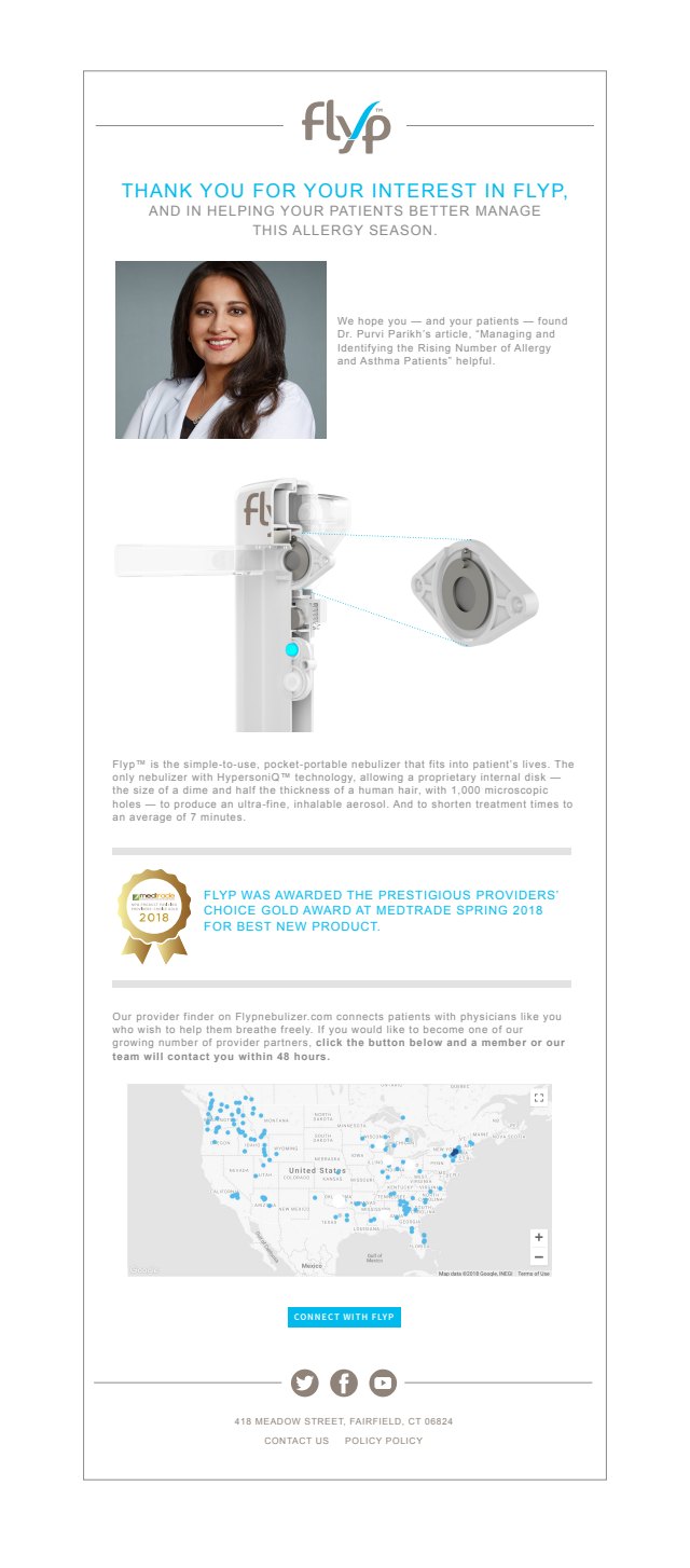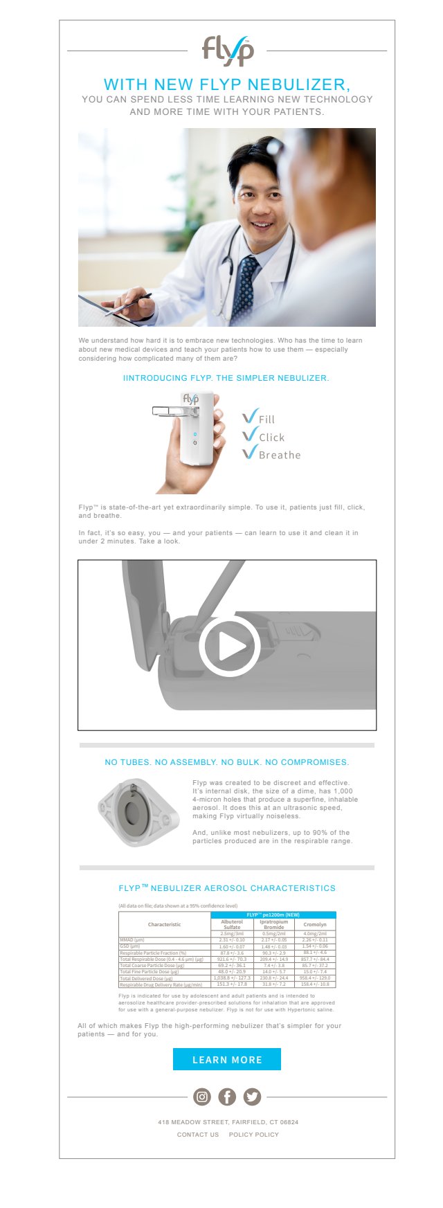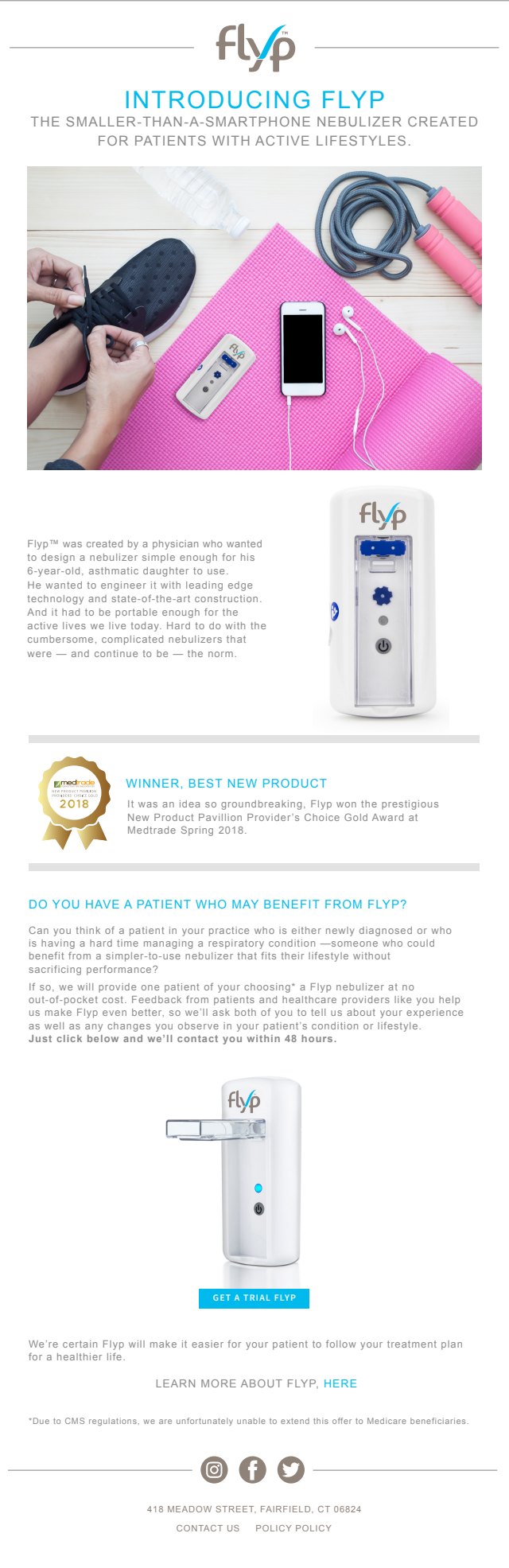 FLYP was the world's first pocket-portable nebulizer. It took only 6 months for us to build a Shopify site, and launch CRM, programmatic and social with outreach to both doctors